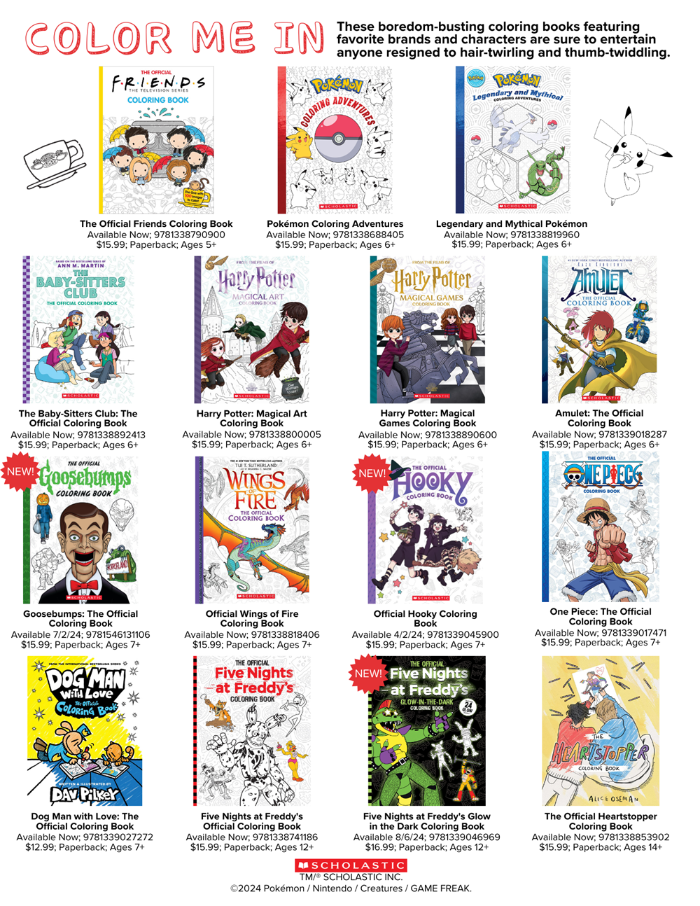 Color in more than 90 pages of your favorite classic Goosebumps covers, taglines, and characters in this official coloring book based on the bestselling series! This official coloring book based on the classic Goosebumps series features more than 90 images to color! Fill in portraits of your favorite creepy creatures and monsters, including Slappy the Dummy, werewolves, scarecrows, haunted masks, and more! Color in patterned pages, classic book covers, and even iconic taglines from the series. This coloring book is perfect for Goosebumps fans of all ages! Format: Paperback ISBN: 9781546131106 Page Count: 96 Trim Size: 8-1⁄2 x 10-7⁄8 Pub Date: July 2024 Fiction / Nonfiction: Fiction Ages: 7 - 10 Grades: 2 - 5 Imprint: Scholastic Inc. Subjects: Arts and Crafts, Colored Pencil Genre: Horror Language: English Return Restrictions: Non-Strippable