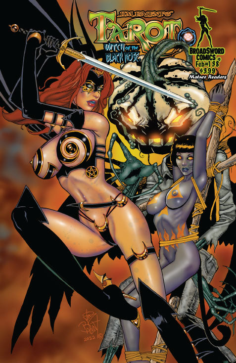 For our 23rd-anniversary Issue, Boo Cat tries to rescue an Herb Witch from an 8 foot tall Gourd Golem. But she is also captured and is tied to poles, making her into a living scarecrow! Tarot tries to rescue them both but soon finds out her Magick is useless against the Golem!
