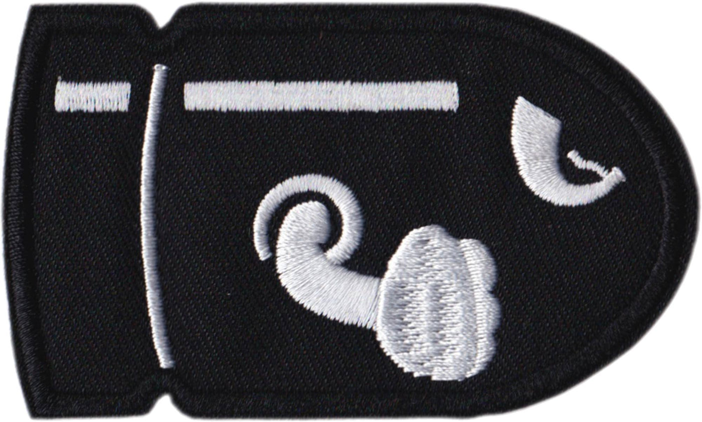 Bullet Bill Embroidered Iron-On Patch Power up your style with this awesome Bullet Bill embroidered iron-on patch. Measuring approximately 3.13 inches wide by 1.88 inches tall, this cut-out patch features the iconic video game character in bold black and white stitching. Perfect for gamers, retro arcade fans, and anyone looking to add a dash of pixel-powered attitude to their jacket, backpack, or hat. High-quality embroidery and an easy-to-use iron-on backing make this patch durable and fun to apply. Show off your love of classic gaming with a design that packs a punch!
