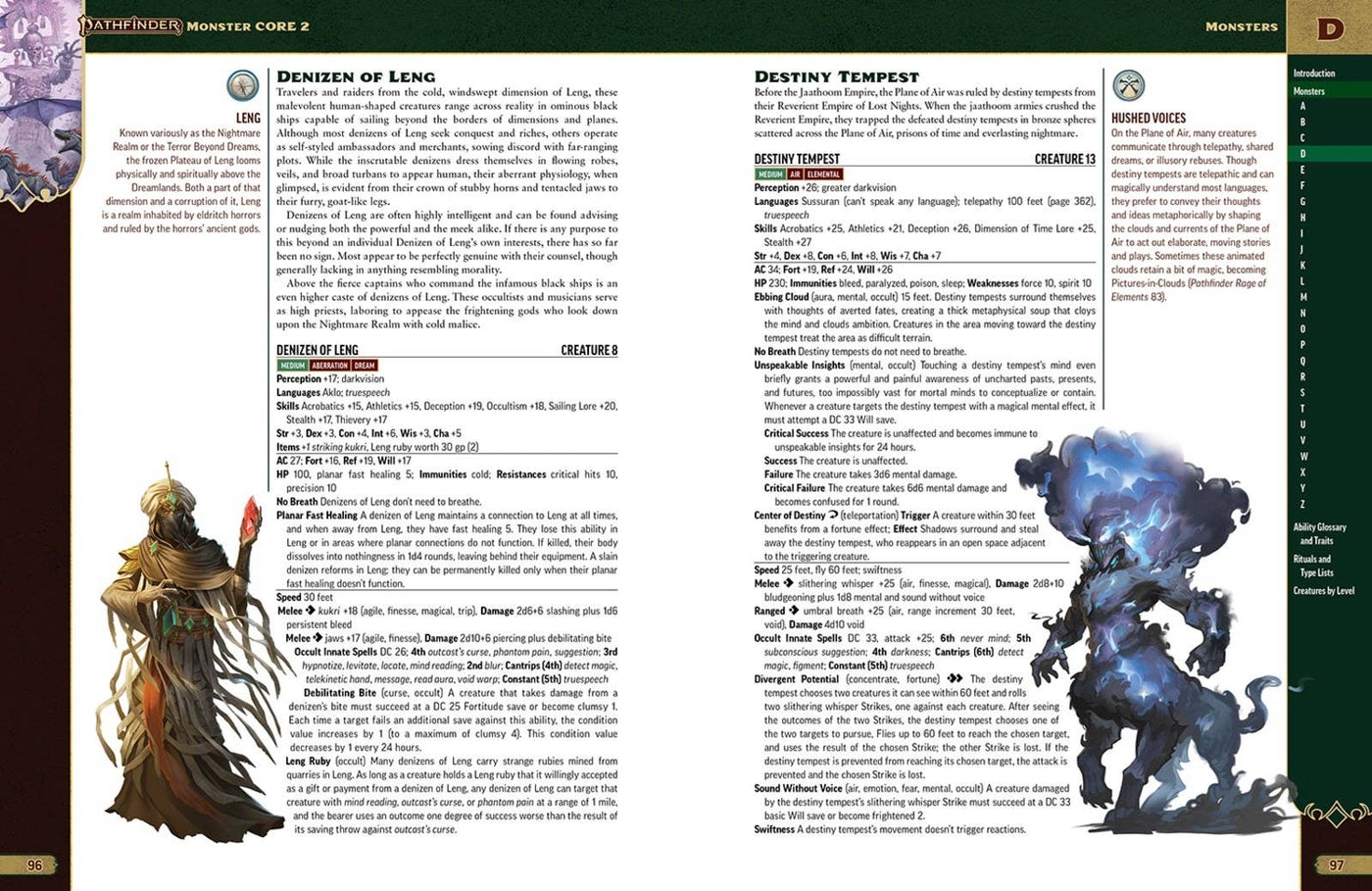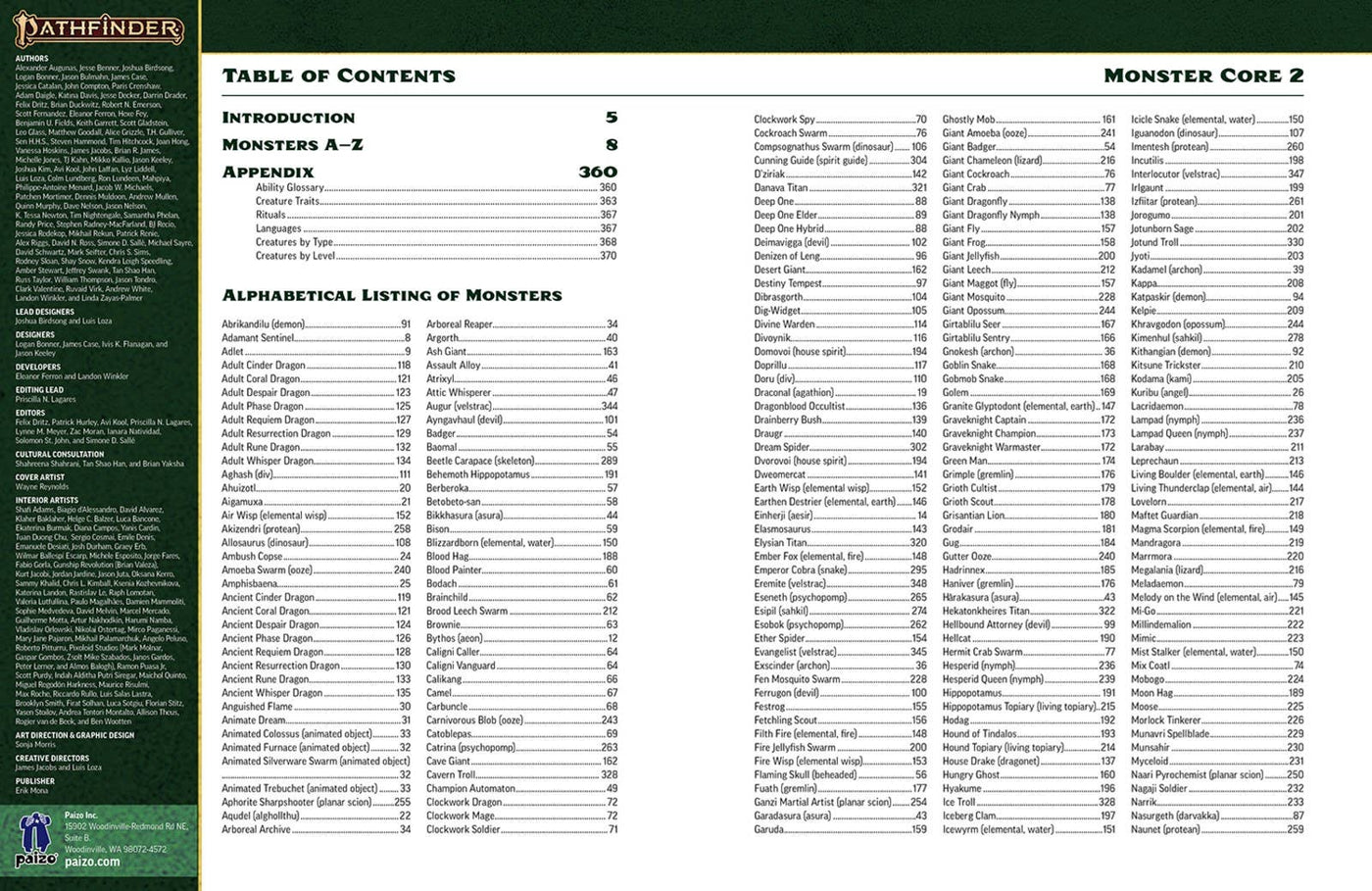 ROLE PLAYING & FANTASY GAMES/ Despite how far heroes travel or how many times they save the day, there are always new monsters lurking just around the corner. Pathfinder Monster Core 2 is a 278-page sourcebook bursting with brand-new creatures as well as updated Pathfinder classics. The lavishly illustrated tome also includes guidelines for reading monster entries and adjusting existing monsters to tailor-fit your story! This book is a must-have for Game Masters ready to bring new and exciting challenges to their games! Included are: Over 300 individual monster writeups. 8 brand-new dragons to challenge your players. Classic monsters drawn from mythology. Simple templates that allow you to customize a monster. Guidelines for reading and using monster statistics. Lists of creatures sorted by both type and level. Hundreds of beautiful full-color creature illustrations!