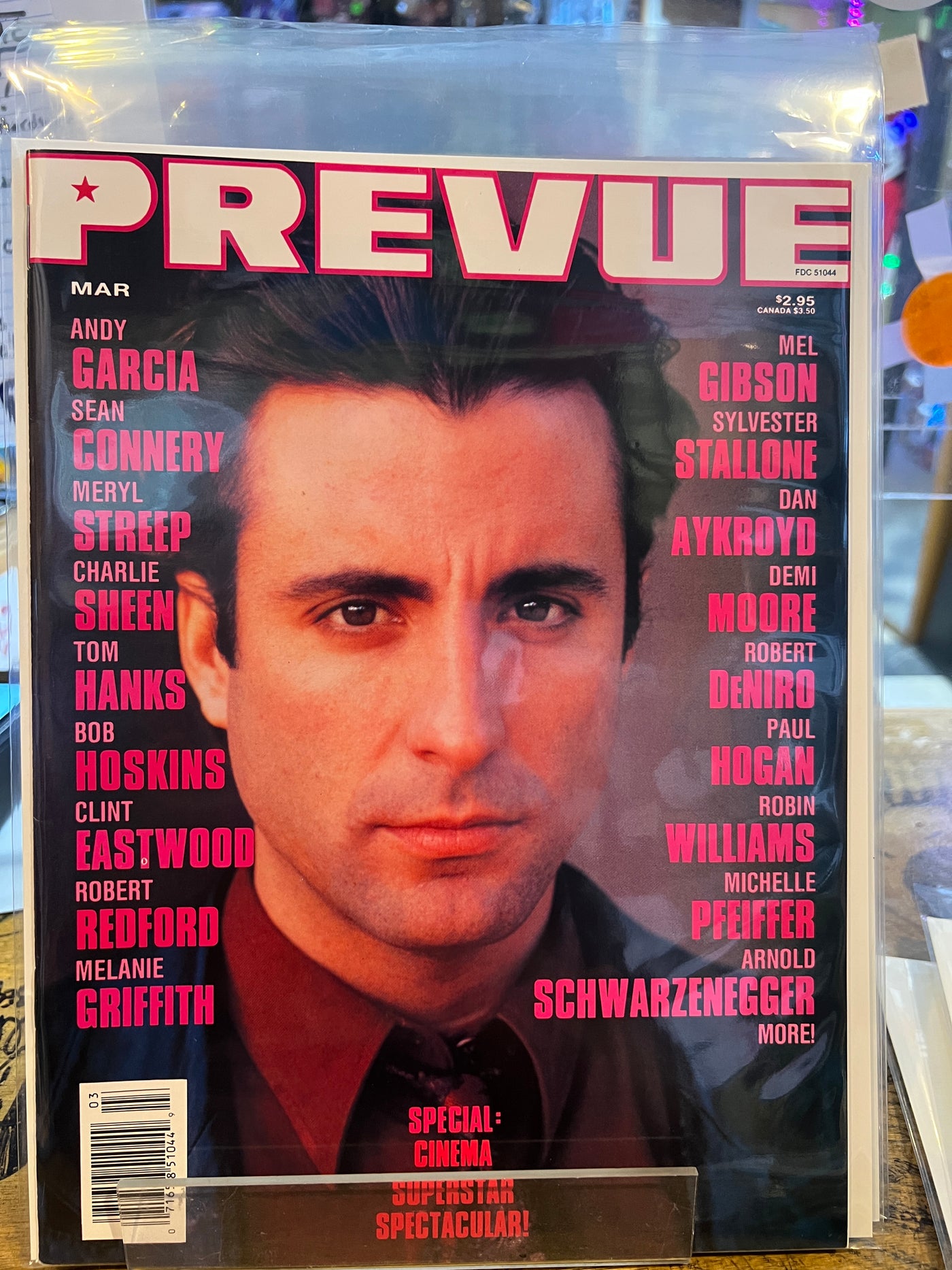 Cinema Superstar Spectacular. Featuring: Andy Garcia (The Godfather: Part III), Sean Connery, Charlie Sheen, Tom Hanks, Mel Gibson (Hamlet), Clint Eastwood, Michelle Pfeiffer, Arnold Schwarzenegger, Robert Redford, Sylvester Stallone, Meryl Streep, Robert DeNiro, Bob Hoskins, Melanie Griffith, Demi Moore, Dan Aykroyd, Paul Hogan, Robin Williams. Andy Garcia cover.