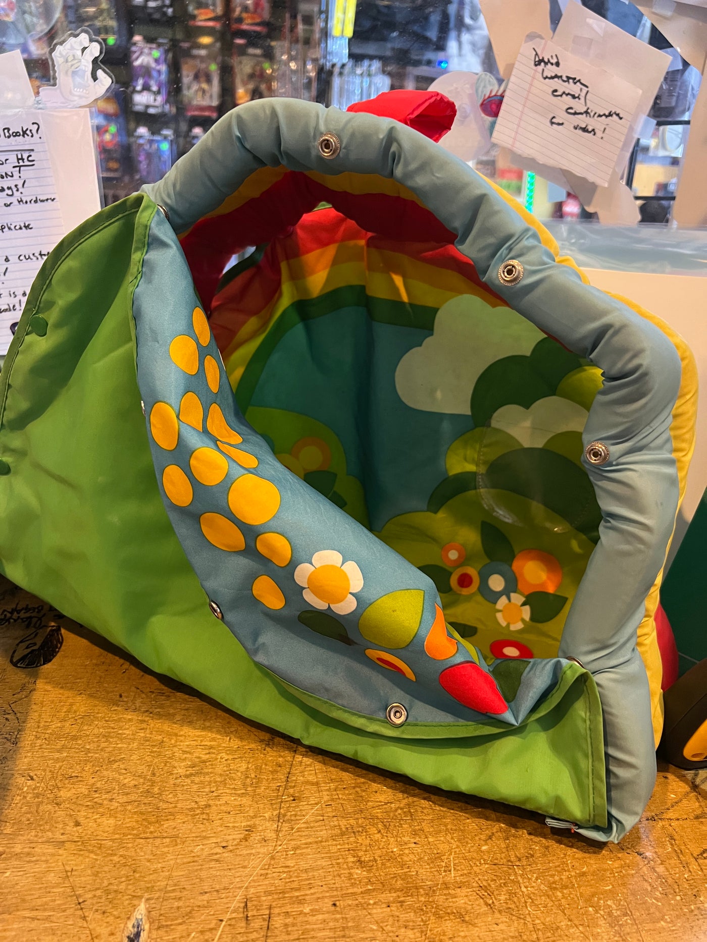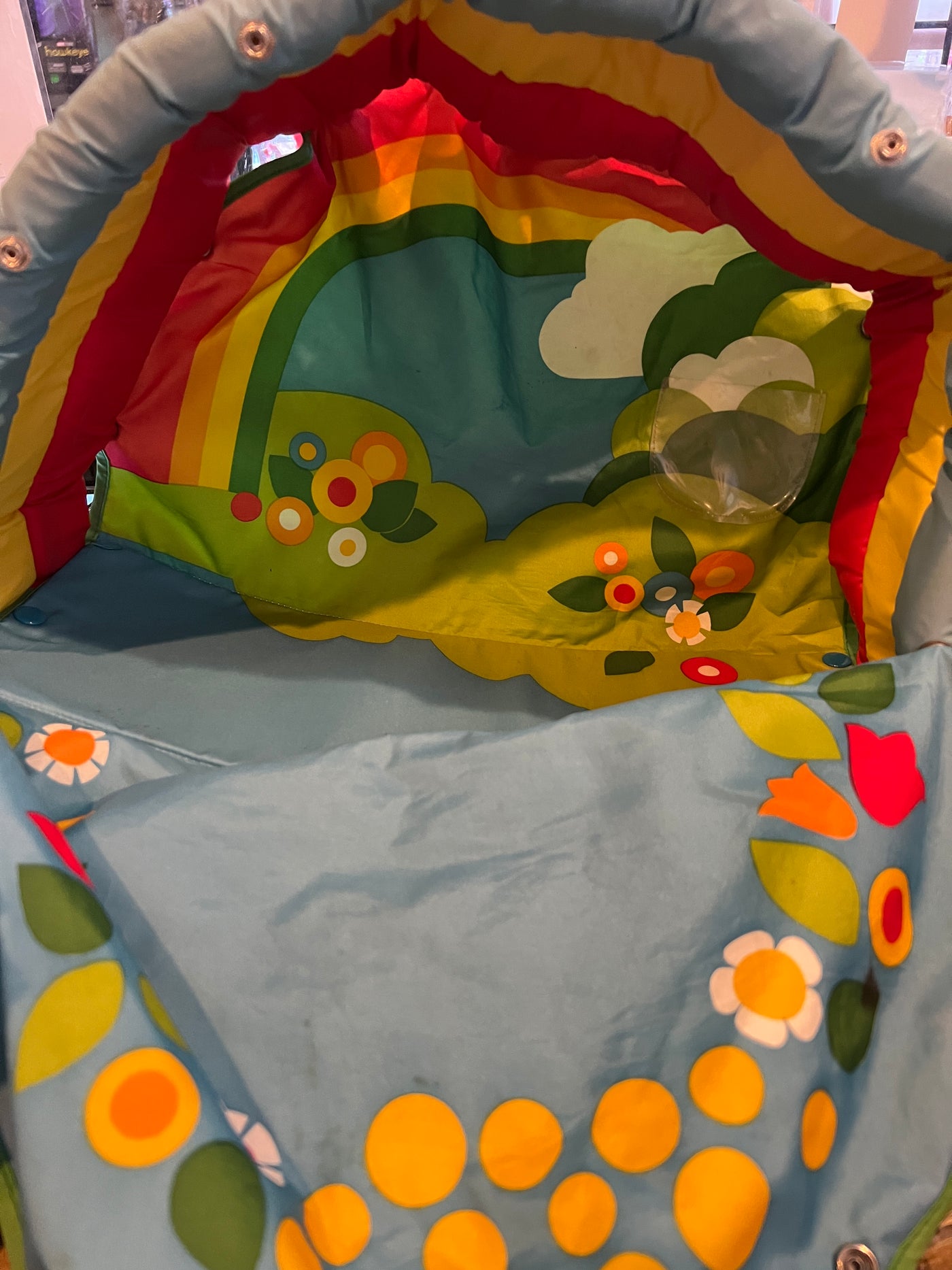 Moderately worn, some discoloration in places. No musty smell, I have wiped it down with disinfectant, but it might brighten up bit after a spin in the washing machine.