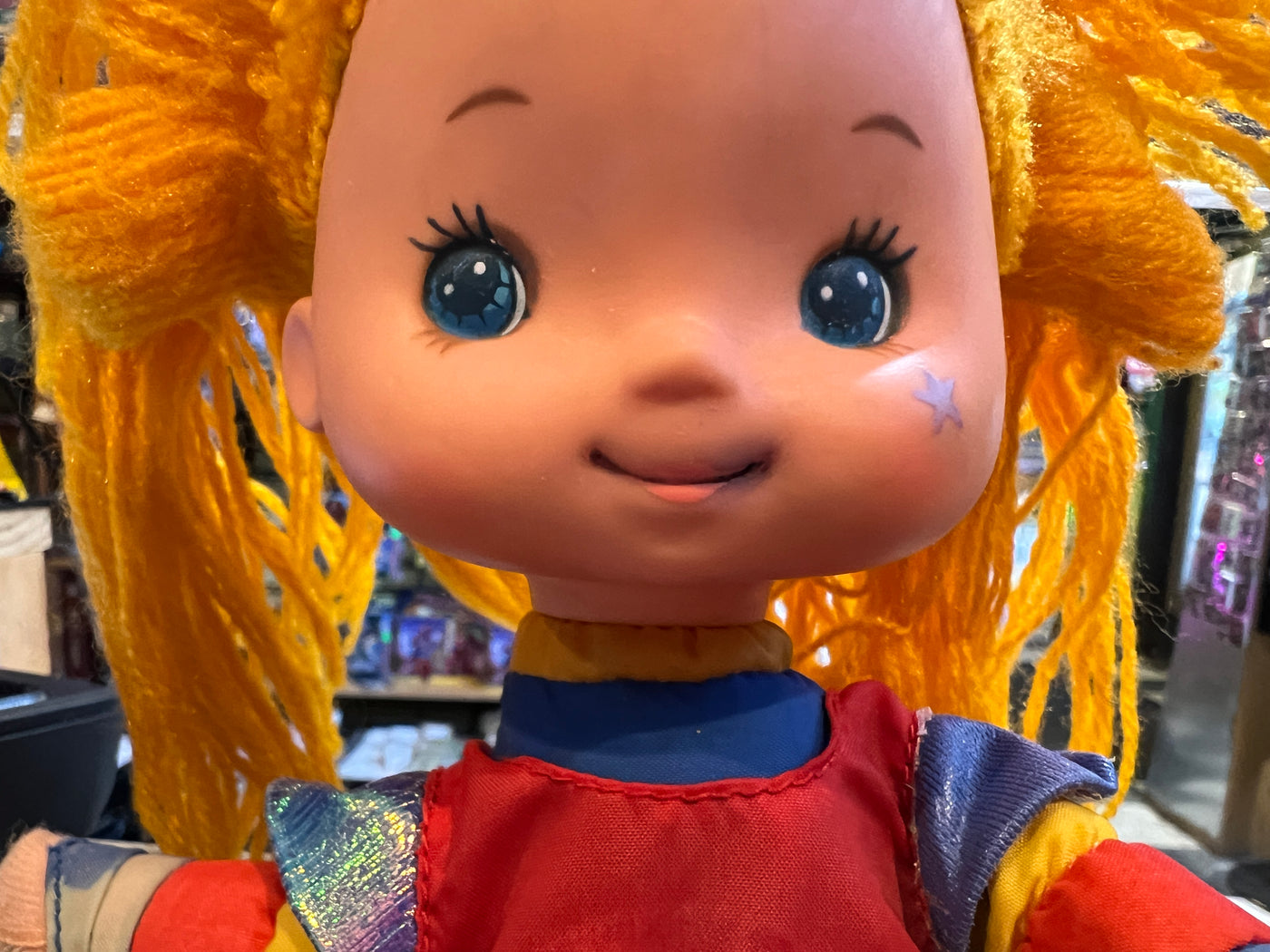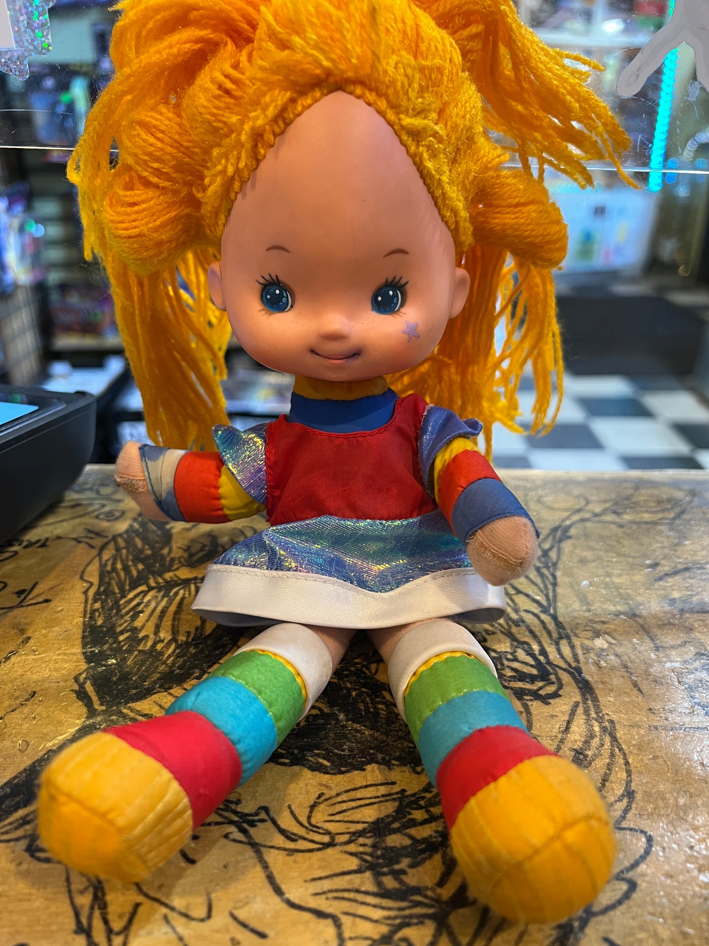 Some ink to the mouth, someone clearly meant to redo the lipstick with a pen... Missing the star logo on the dress, otherwise dress looks clean with working snap.
