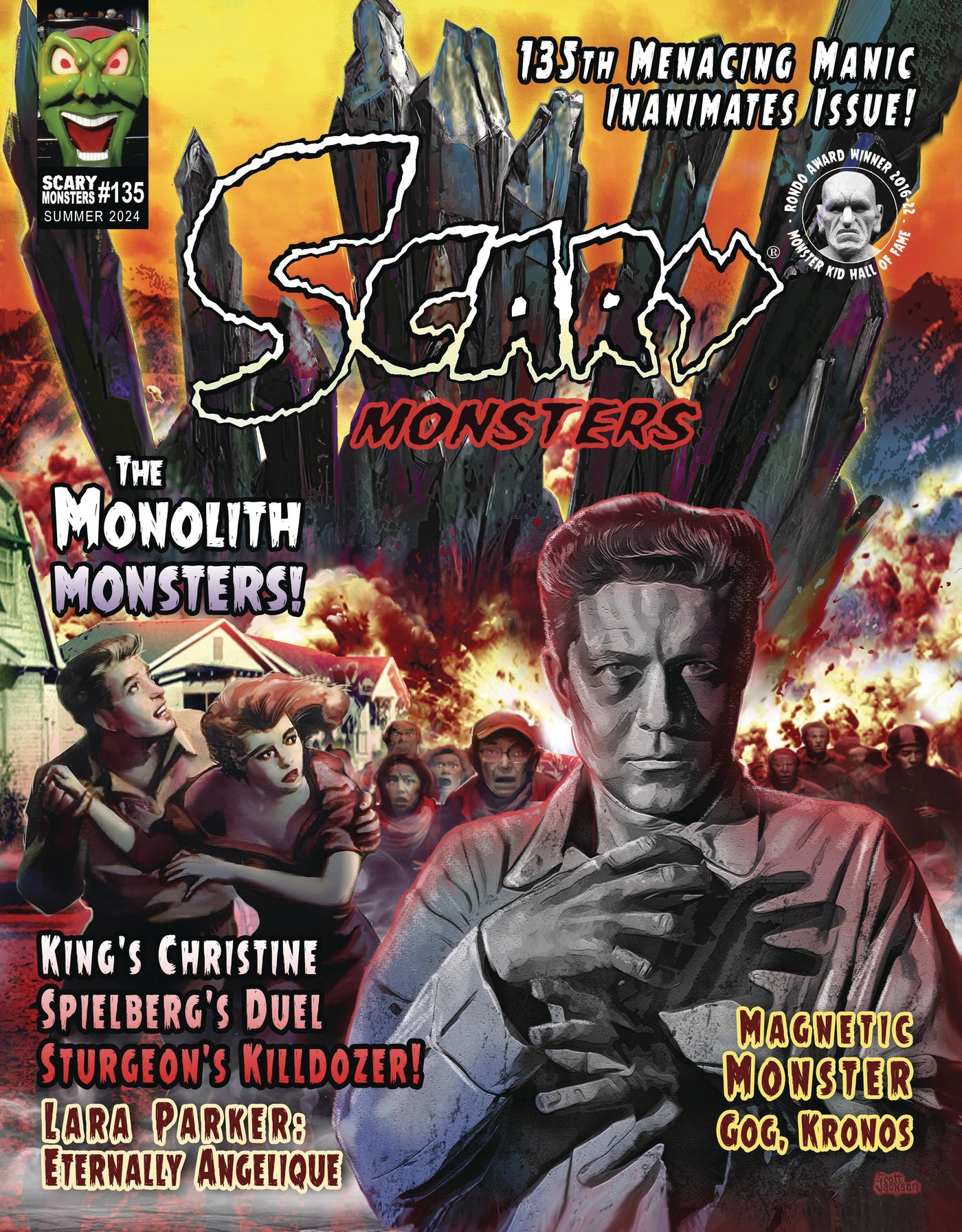 Our Scary Monsters 135th "Menacing Manic Inanimates" issue puts the scary spotlight on classic and not-so-classic films featuring unfeeling, unthinking, and unstoppable monsters gone rogue, such as The Monolith Monsters, Christine, Duel, Killdozer, and many more! Plus, the return of our regular columns Trilogy of Terror, Kaiju Korner, Strange Days, and comic strip Roomies from the Tomb on square-bound retro pulp pages loaded with photos.