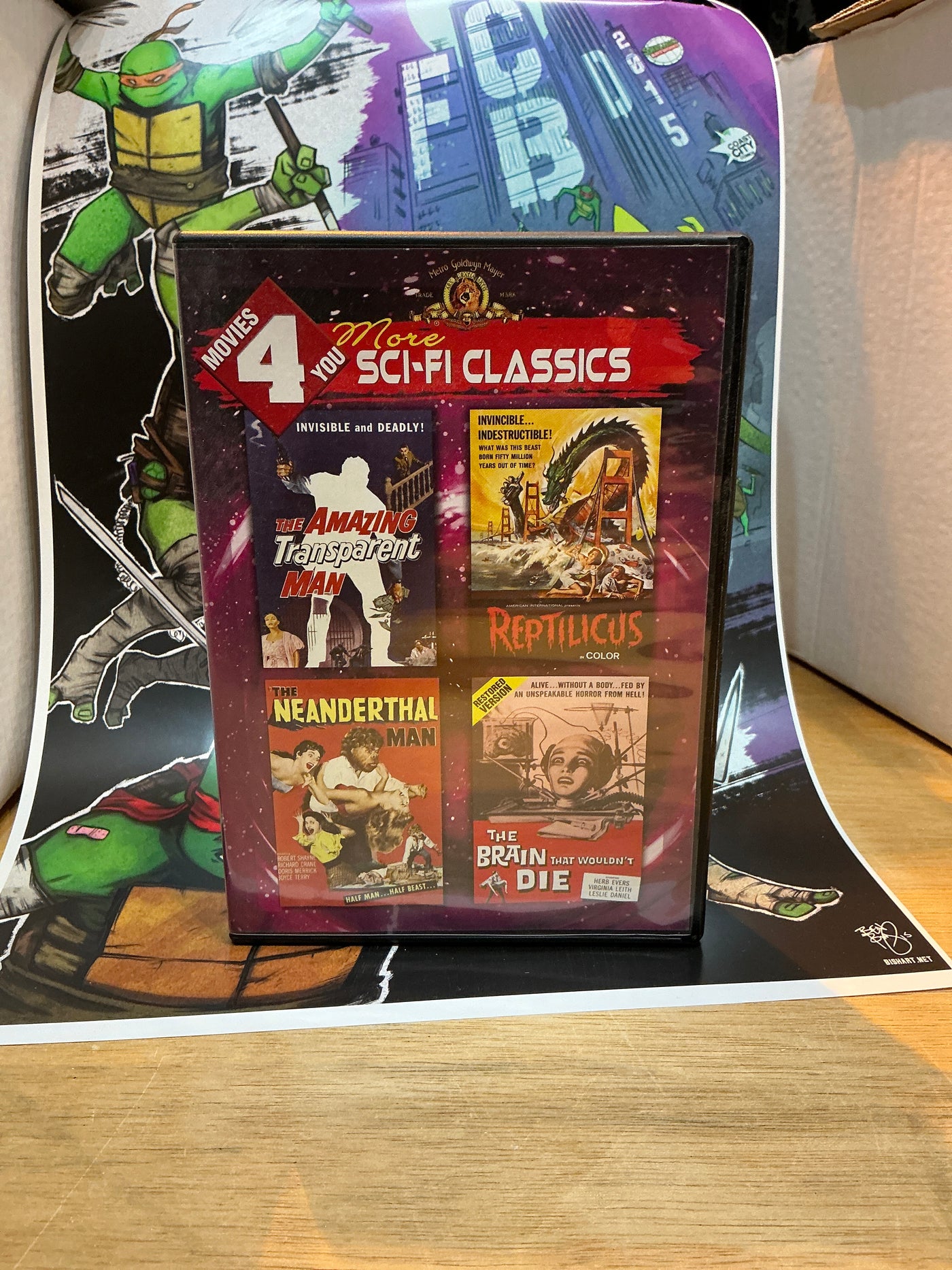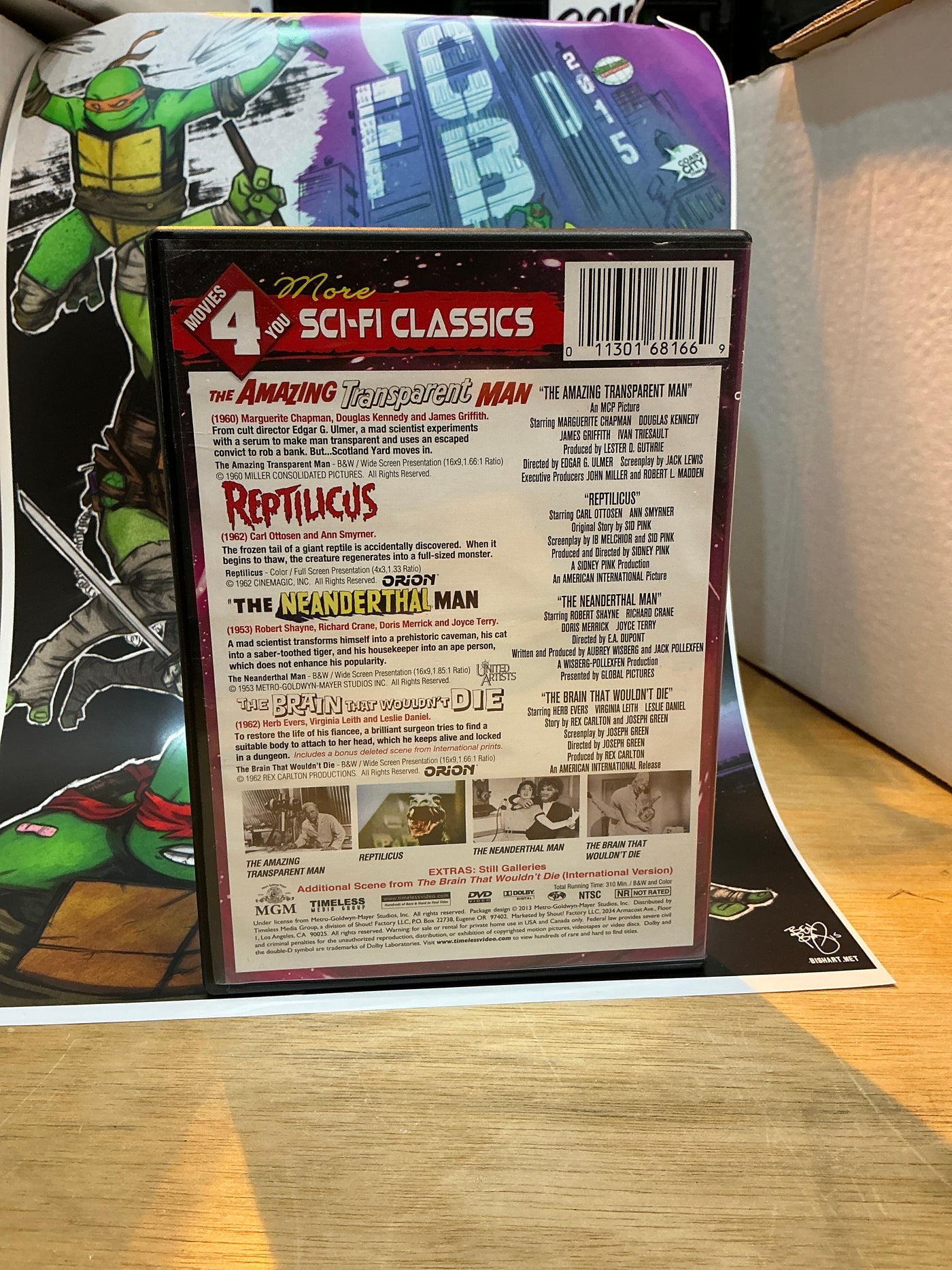 Four classic Sci-Fi movies: The Amazing Transparent Man, Reptilicus, The Neanderthal Man, and The Brain that Wouldn't Die
