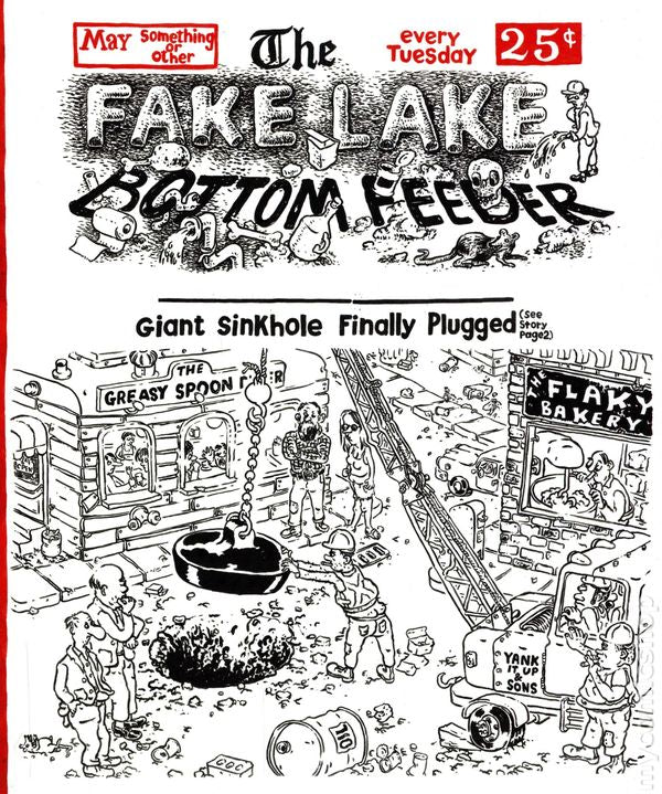 The town of Fake Lake is a sludge pit of goings on and the Fake Lake Bottom Feeder (the local paper) has been kept busy chronicling what amounts to a mild apocalypse: collapsing bridges, a gap in the street that swallows the high school band, an awful bacterial business at the hot springs and a great blowout at the Fakeola bottling plant. Fake Lake is a replica of a weekly edition of the paper, complete with Children's Section (try not to freak out Trippy the clown), Industrial News (it's work injury week, again), a fulsome Food Section (beware the Flakey Bakery's Sticky Buns) and a special double page spread of the Dregs Coffee Shop's Sponsored Expedition to Ascend Old Frothy (their espresso machine) with exclusive photos of bearded hipster explorer types hip deep in milk foam.