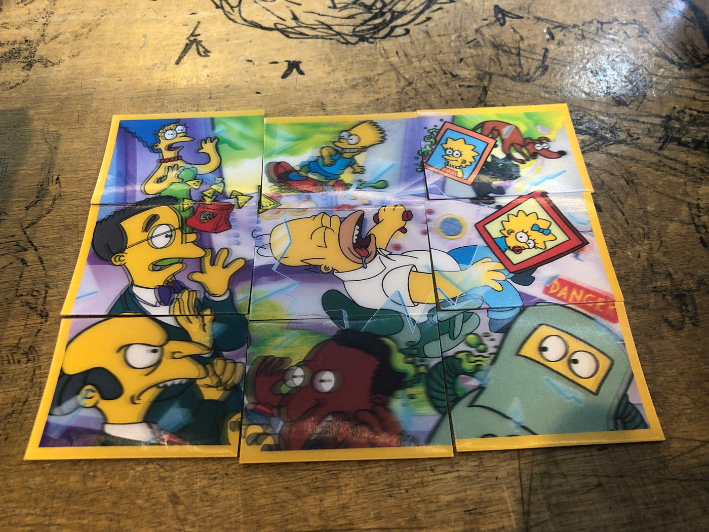 Simpsons "A Day At The Office" Lenticular Puzzle. One of three different lenticular puzzles released by Smiths Food Products in Australia. This puzzle consists of 9 pieces that when placed together form a puzzle picture. Inserted one puzzle piece per bag of chips in Australia in 1998.