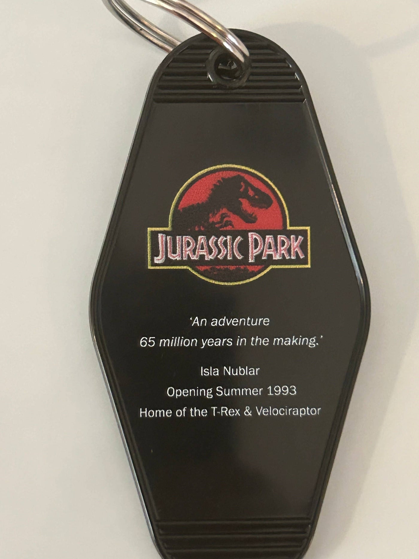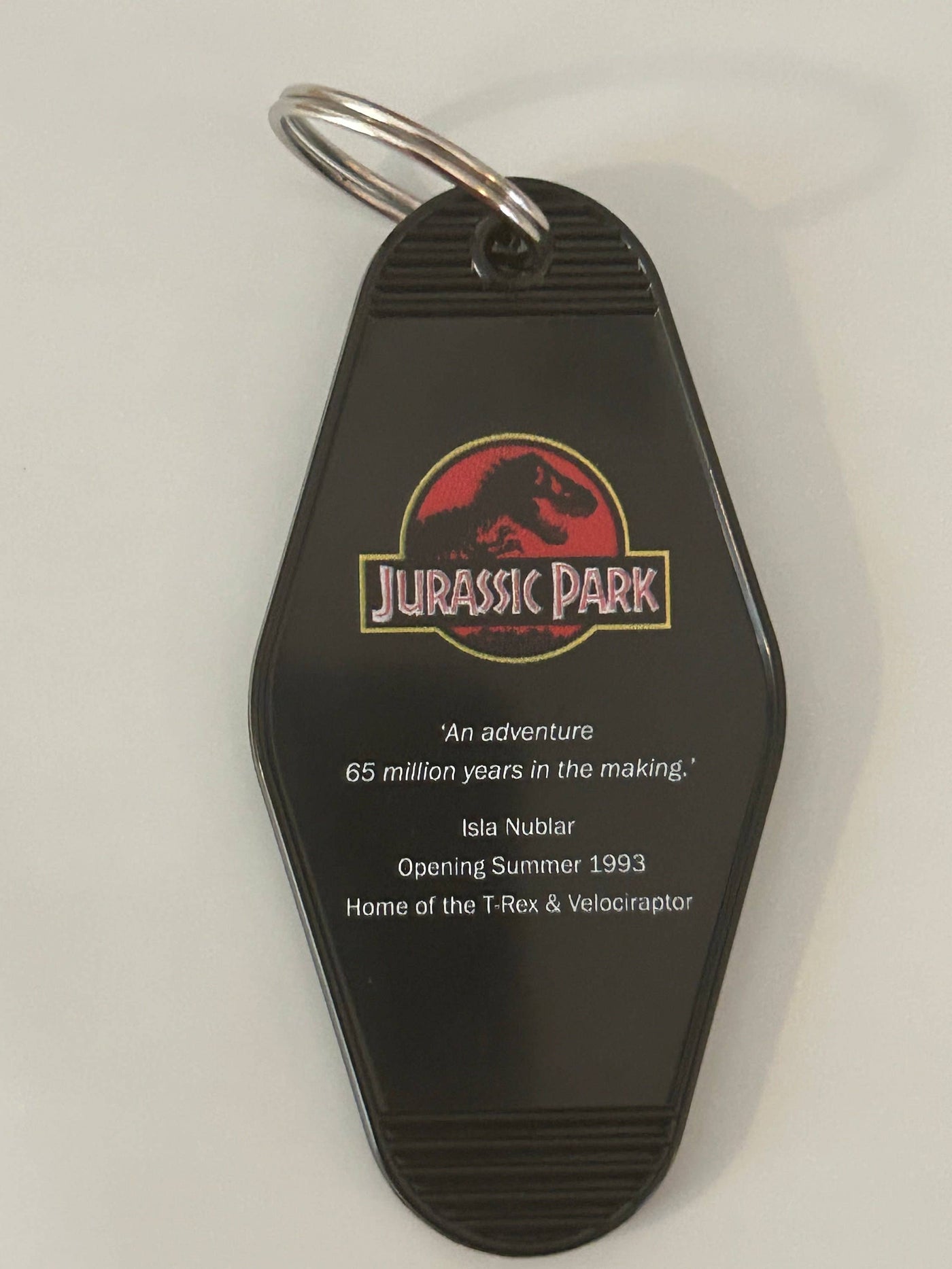 Jurassic Park Inspired Movie Keytag. JURASSIC PARK Inspired Keytag: Embark on a thrilling journey through prehistory with the JURASSIC PARK Inspired Keytag. Crafted from durable plastic, this 3 1/2 x 1 1/2-inch keytag captures the awe and wonder of the iconic franchise. The single-sided print proudly displays the JURASSIC PARK logo, a symbol of adventure and discovery that has captivated generations. As you attach your keys to the metal o-ring, you'll feel a sense of excitement reminiscent of exploring the dinosaur-filled landscapes of Isla Nublar. This keytag isn't just a piece of plastic; it's a portal to a world where science and imagination collide, where ancient creatures roam and the possibilities are as limitless as the Cretaceous sky. Carry a piece of cinematic history and the thrill of the unknown with the JURASSIC PARK Inspired Keytag.