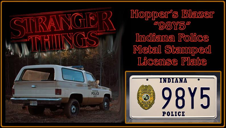 The Indiana 98Y5 License Plate is produced as seen on Chief Hopper’s Police K5 Blazer. This 1980 K5 Chevy Blazer has been the trusted vehicle of Chief Hopper during all three seasons of the series Stranger Things.